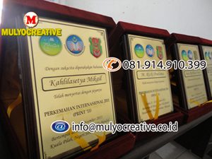 Seorang penyelenggara sebuah event tentunya juga ingin pesan Plakat Vandel Piala Trophy dengan model yang berbeda agar terlihat lebih elegan dan istimewa. Hal inilah yang mendasai banyaknya pesan Plakat Vandel Piala Trophy custom. Sehingga, Andapun bisa pesan Plakat Vandel Piala Trophy secara custom di Mulyocreative untuk mendapatkan berbagai pilihan pesan Plakat Vandel Piala Trophy yang diinginkan. Sehingga hadiah kompetisi pun terasa lebih menggiurkan dalam sebuah acara apabila Plakat Vandel Piala Trophy yang diberikan pada peserta pun beda dari yang lainya.