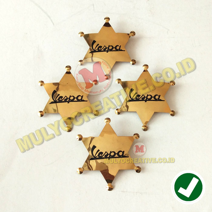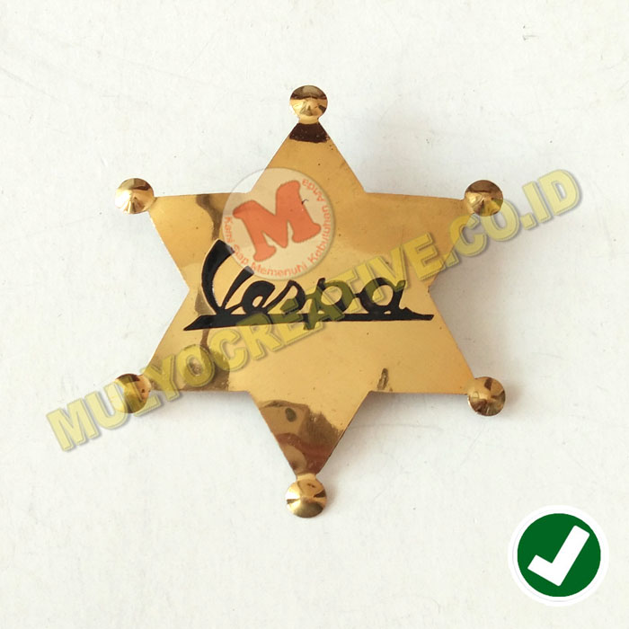 Mulyo Creative jual dan sedia macam-macam lencana, pin, bros, badges. Diantaranya adalah Jual Pin Lencana Logo Vespa Motif Bintang Sheriff Bahan Kuningan