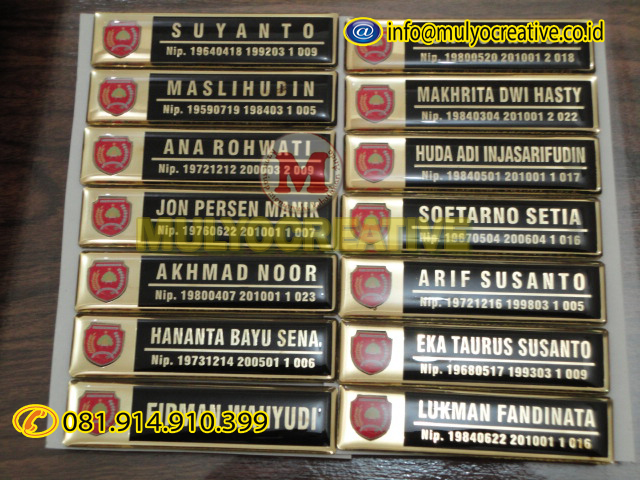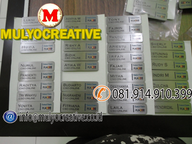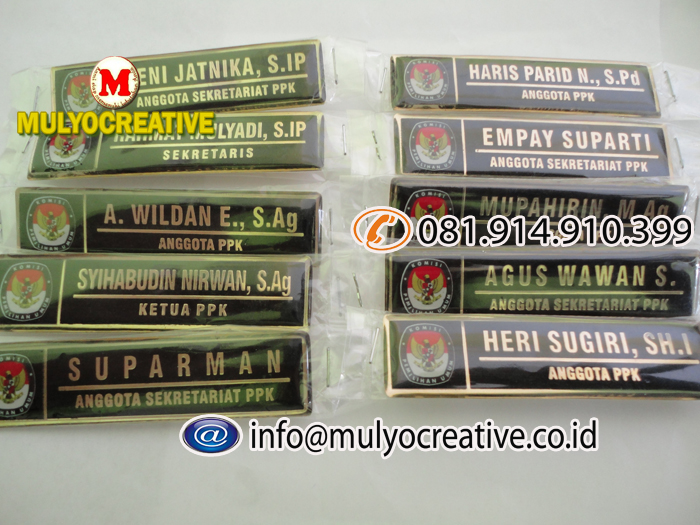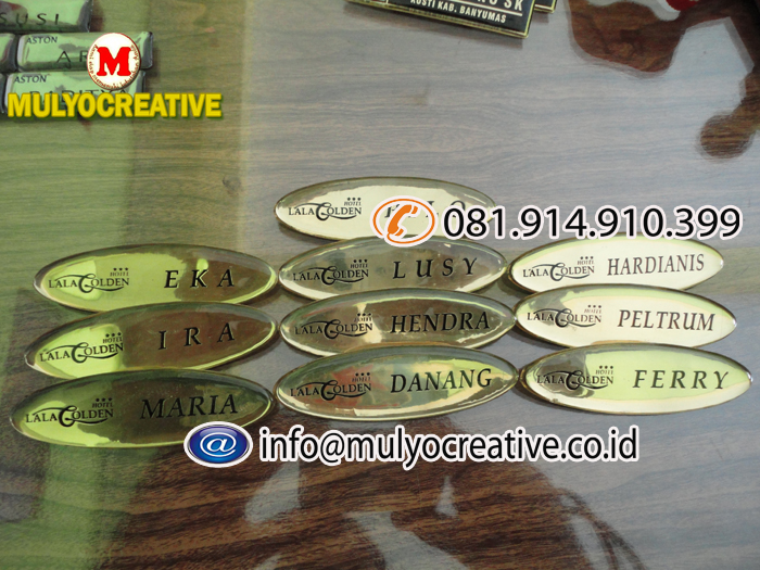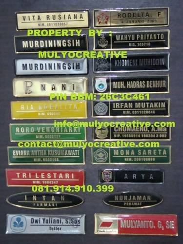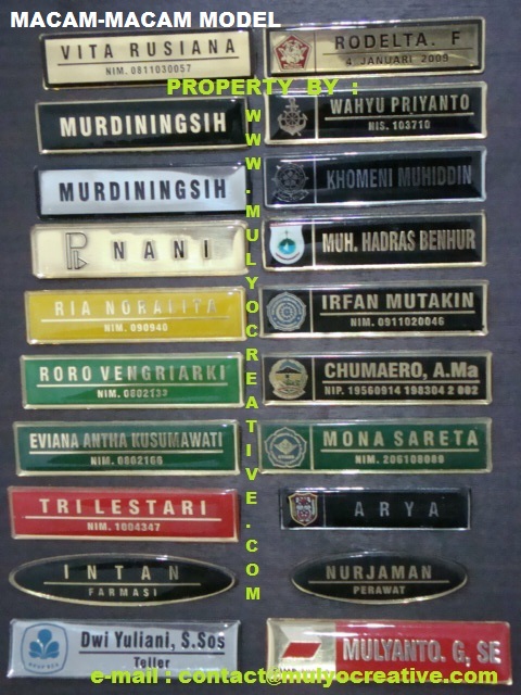 KAMI WWW.MULYOCREATIVE.COM MEMPRODUKSI LANGSUNG / SENDIRI, BIKIN, BUAT, JUAL, PESAN, NAMA DADA, NAME TAG, NAMA FIBER, PAPAN NAMA DADA, PAPAN NAMA, PAPAN NAMA MAGNIT, PIN, LENCANA, ETSA, ETCHING, UNTUK MAHASISWA. PEGAWAI NEGERI, INSTANSI PEMERINTAH, INSTANSI SWASTA, SPG, PRAMUKA, PERAWAT, DOKTER, DLL.