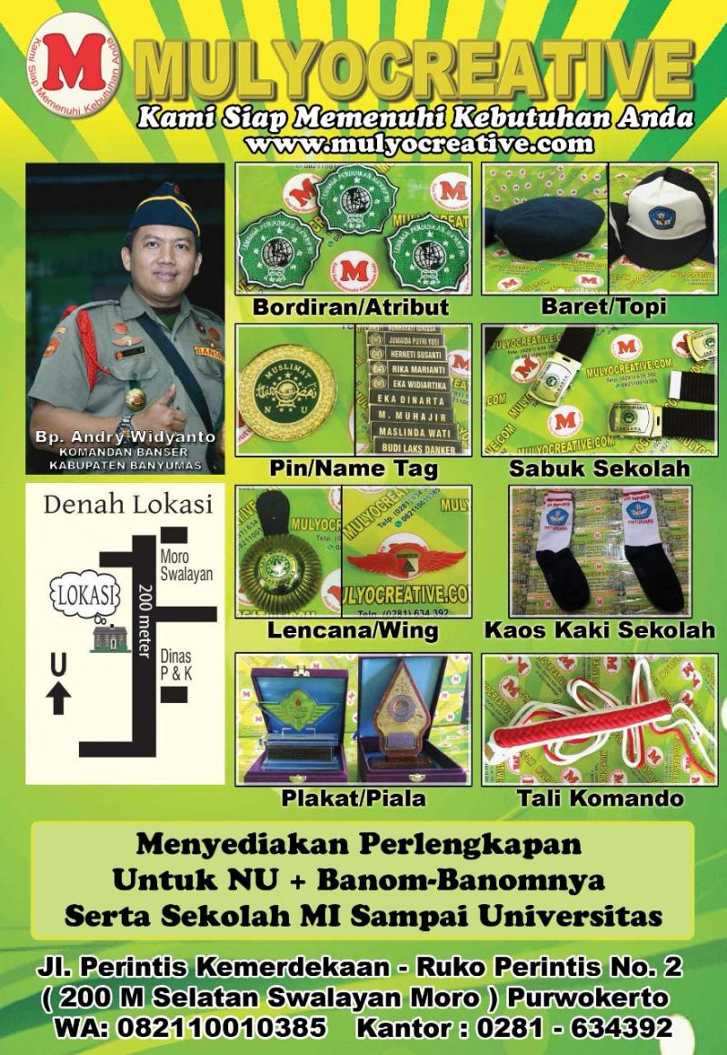 Mulyo Creative menerima pembuatan/ pesanan dan menjual berbagai perlengkapan/ atribut Muslimat NU, diantaranya Lencana NU , Pin NU, Bordiran dengan harga yang di sesuaikan dengan desain yang di kehendaki